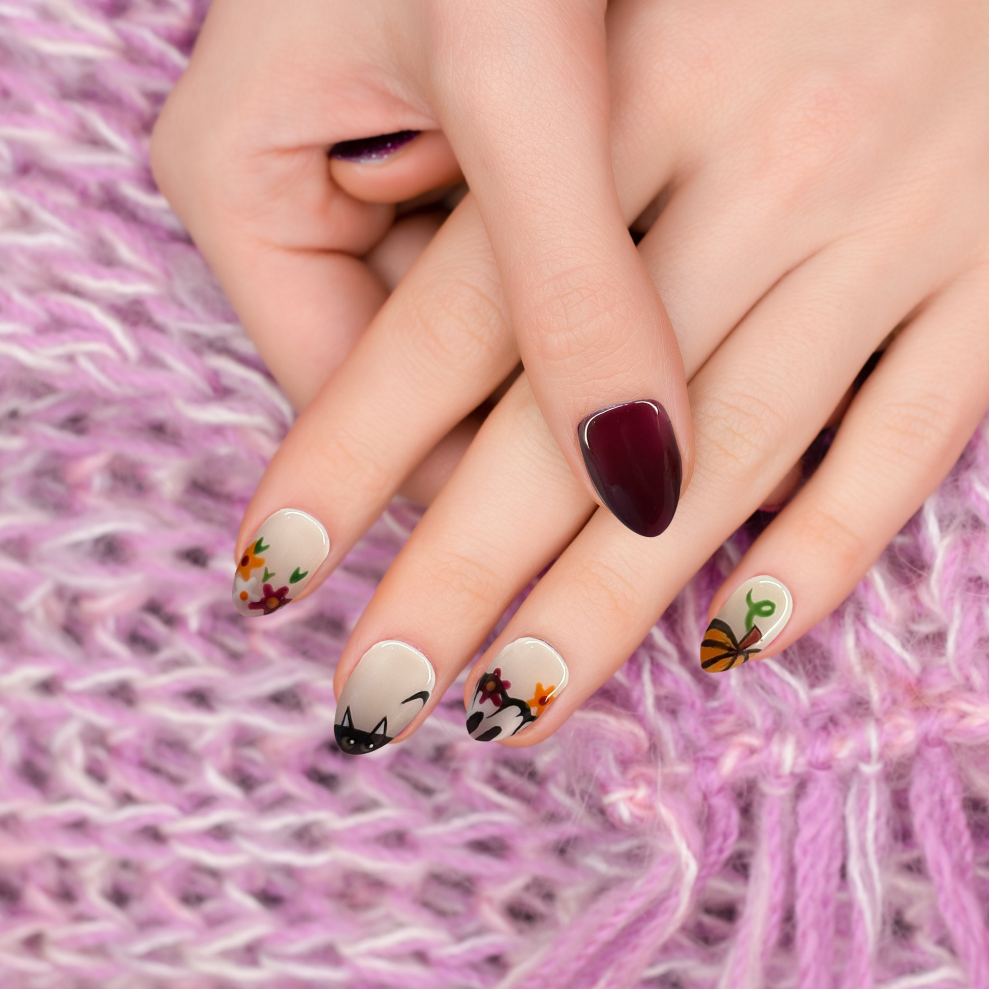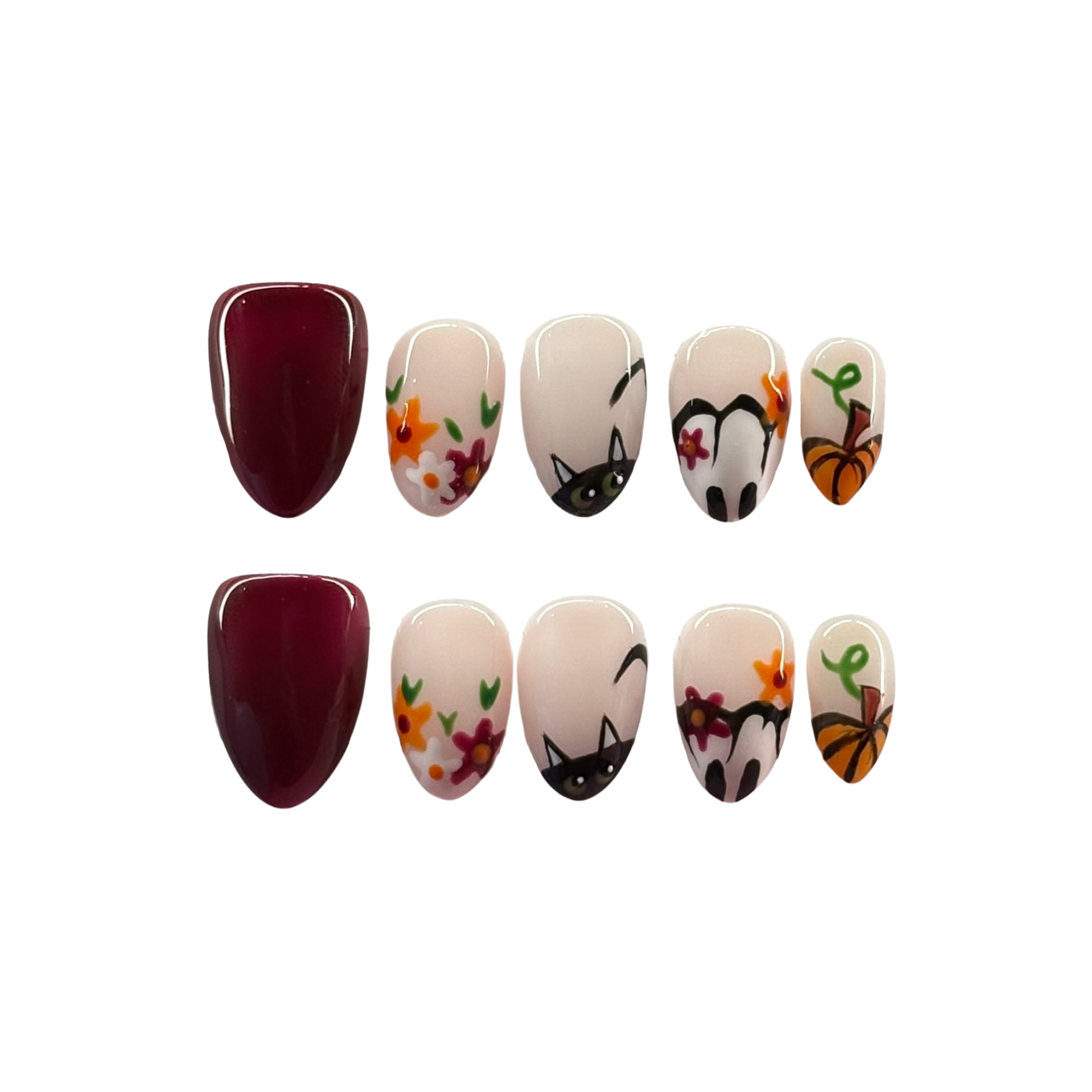 Lucky cat silhouettes framed by delicate florals bring a sweet-meets-spooky energy you can wear year-round. The glossy surface highlights every petal and curve for a polished finish in photos.
