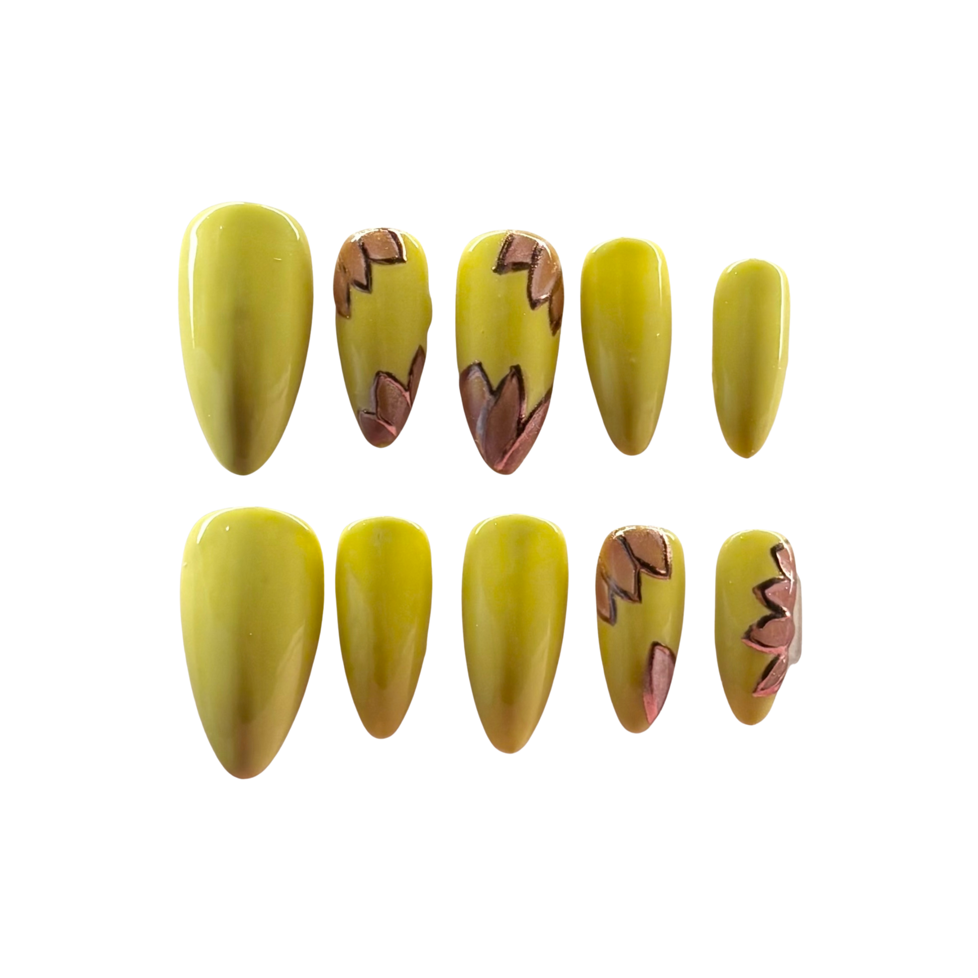 Lush green base topped with rose-gold floral line work. Romantic yet grounded, this set looks beautiful with sweaters and satin dresses alike.