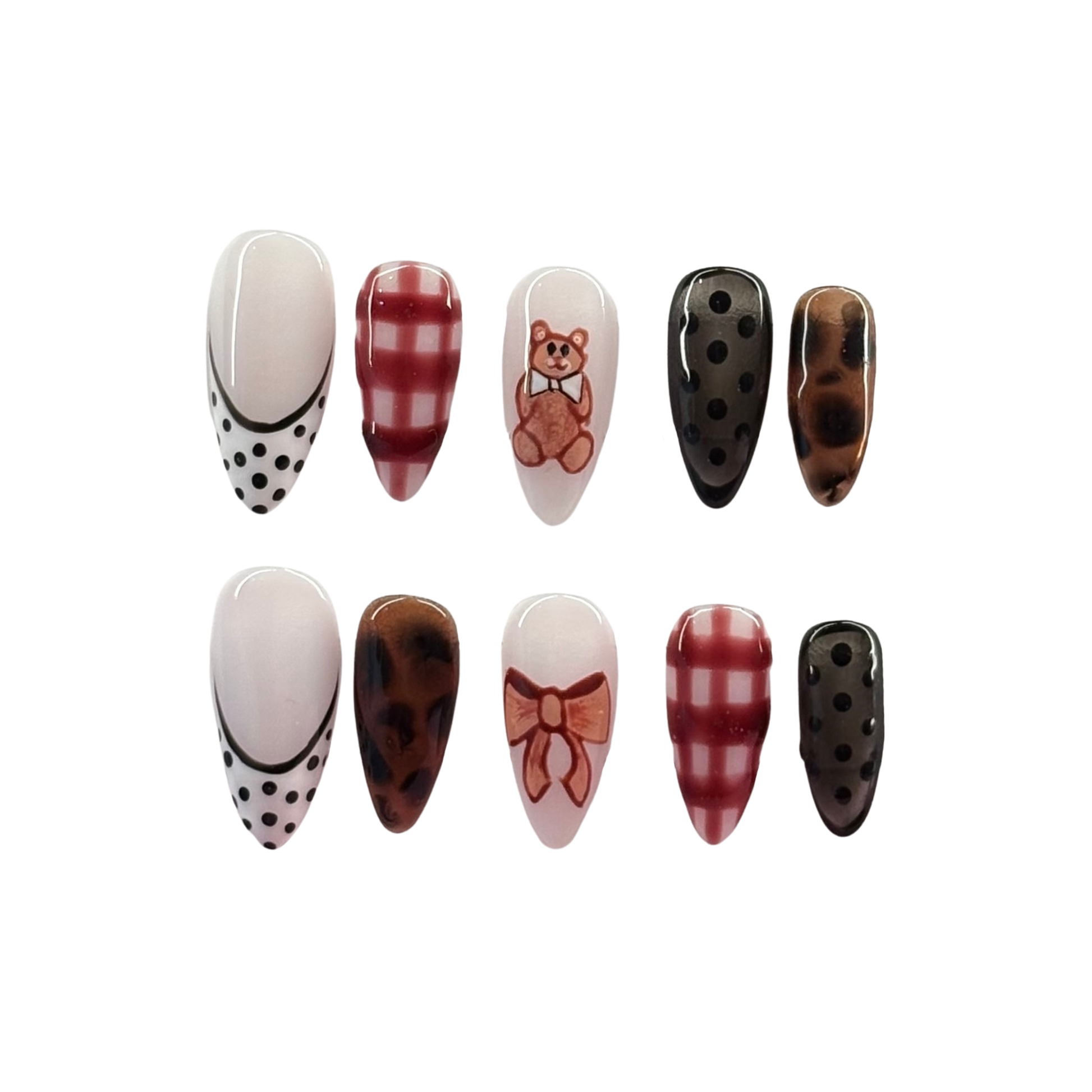 Shown in photos for style reference. Available in almond or square, short or long.